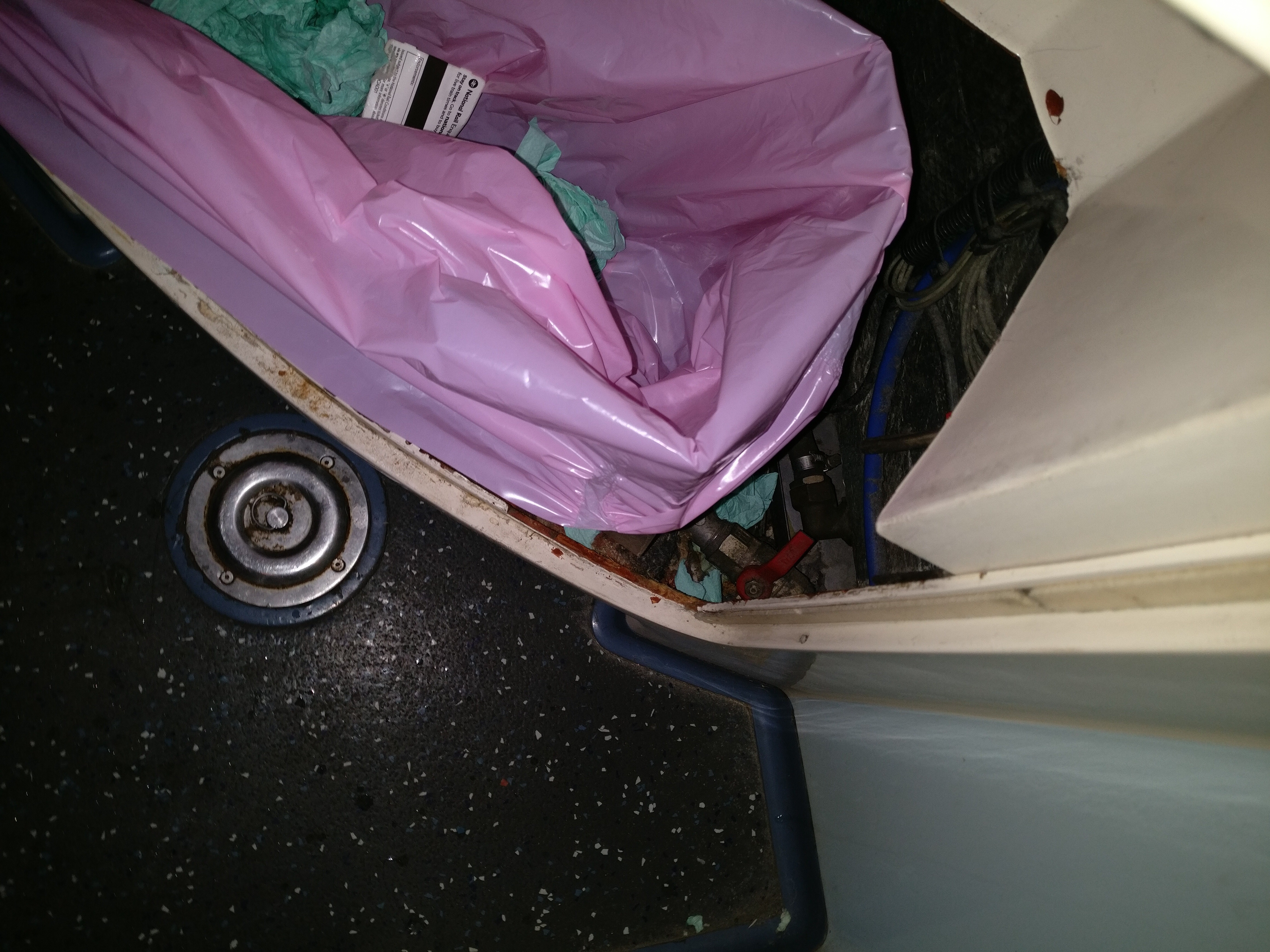 The exposed pipework and flooded floor bin and sink made me retch. Imagining allsorts lurking down under I got a grip…Anti bac gel, catheter and made it….just…to my horror …my train ticket has fallen down the horrible toilet bowl .