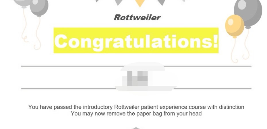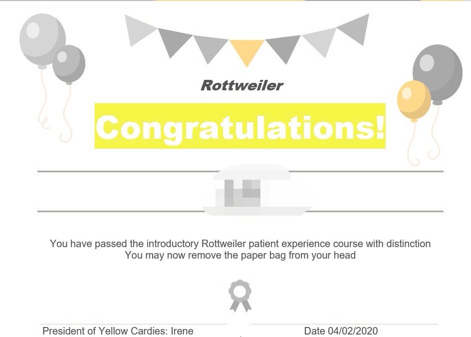 Meanwhile another amazing friend has undergone a hysterectomy on account of ovarian cancer. Of course I know all about hysterectomy operations. I also know about ovarian cancer… Thanks to Patsie. So I’ve tried to say nothing but listen. Of course I know about and explained TWOCS, ( trial without catheter), using a pillow to help cough, pain, painkillers and so much more. My heart goes out to her and her family. We can do this I told her tonight. I also printed her a level 1 certificate of Rottweiler. My suggestions for ways forward , after cancelled clinics, crappy communications and unbelievable delays, she, as she recounts, put a paper bag over her head, took my advice and complained and protested and did an amazing School of Rottweiler reorganisation of Addenbrookes.